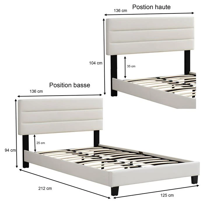 - Kopfteil verstellbar: Mindesthöhe 94 cm, mittlere Höhe 99 cm, maximale Höhe 104 cm