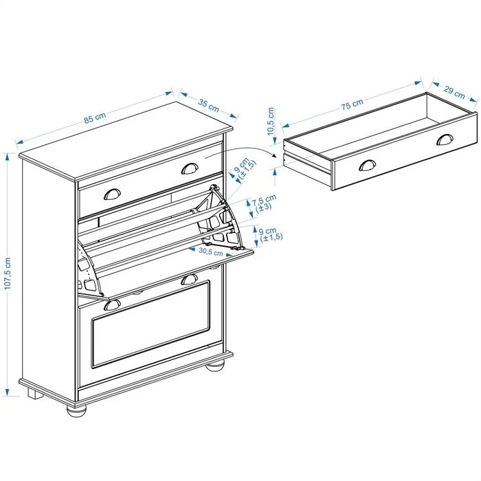 - 1 große Schublade & 2 große Schuhklappen